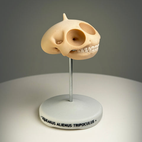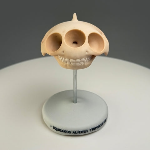 The skull of Squeakus Alienus Tripoculus is a highly specialized structure evolved for both interstellar sensory perception and rudimentary vocal mimicry. Approximately 5 cm in diameter, the cranium is disproportionately large relative to body mass, exhibiting a smooth, domed parietal region that suggests a cartilaginous cranial plate rather than true ossification—likely an adaptation to low-gravity environments.