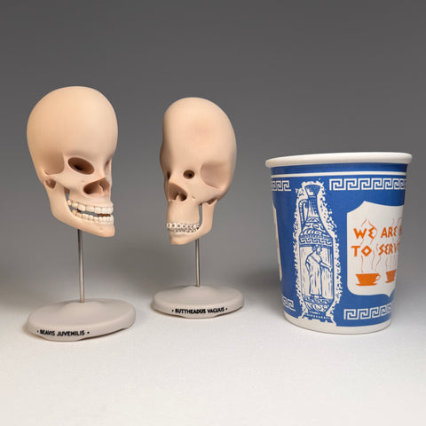 Vacuus Juvenilis refers to a paired cranial specimen exhibiting pronounced developmental irregularities and atypical cognitive morphology. The skulls are characterized by enlarged frontal curvature, suggesting an overextended prefrontal region, yet paradoxically lacking corresponding internal complexity. Cranial vault thickness is inconsistent, with areas of apparent structural redundancy juxtaposed against regions of notable hollowness.